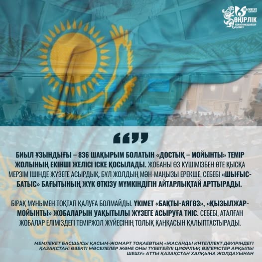 Биыл ұзындығы – 836 шақырым болатын «Достық – Мойынты» темір жолының екінші желісі іске қосылады. Жобаны өз күшімізбен өте қысқа мерзім ішінде жүзеге асырдық. Бұл жолдың мән-маңызы ерекше, себебі «Шығыс-Батыс» бағытының жүк өткізу мүмкіндігін айтарлықтай арттырады.