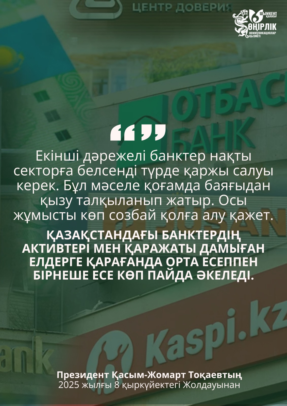 Президенттің Жолдауында атап өтілгендей, Қазақстандағы банктердің активтері мен қаражаты дамыған мемлекеттермен салыстырғанда орта есеппен бірнеше есе жоғары пайда әкелуде.