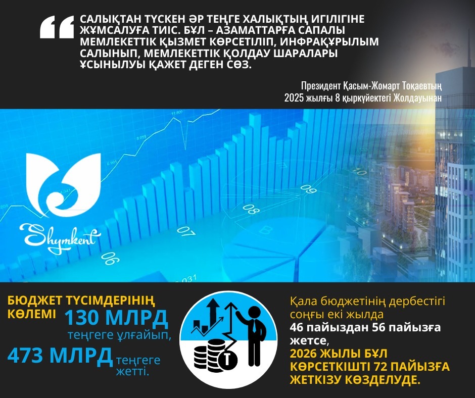 Осы бағытта Шымкент қаласының бюджет түсімдері жыл сайын тұрақты өсіп келеді. Соңғы екі жылдың ішінде қала қазынасы 130 млрд теңгеге артып, 473 млрд теңгеге жетті. Сонымен қатар, бюджет дербестігі 46%-дан 56%-ға көтерілді.