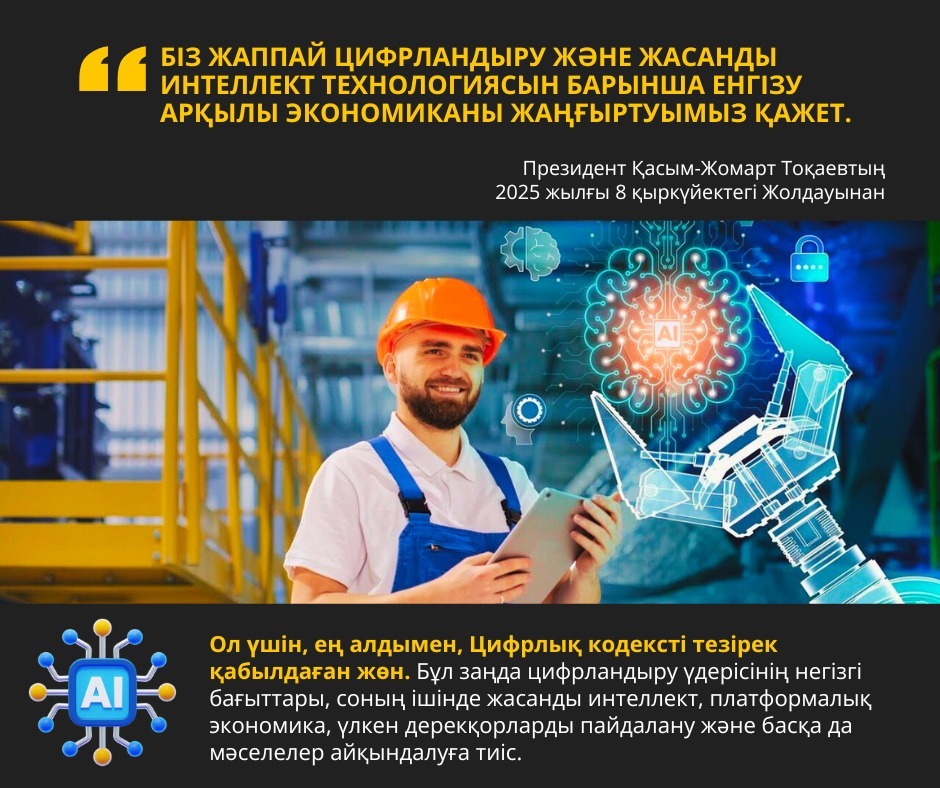Қазақстан Президенті Қасым-Жомарт Тоқаев 2025 жылғы 8 қыркүйектегі Жолдауында цифрландыру мен жасанды интеллект технологияларын жаппай енгізудің маңыздылығын атап өтті. Мемлекет басшысы экономиканы жаңғыртудың негізгі тетігі ретінде цифрлық инновацияларды дамыту қажеттігін айтты.